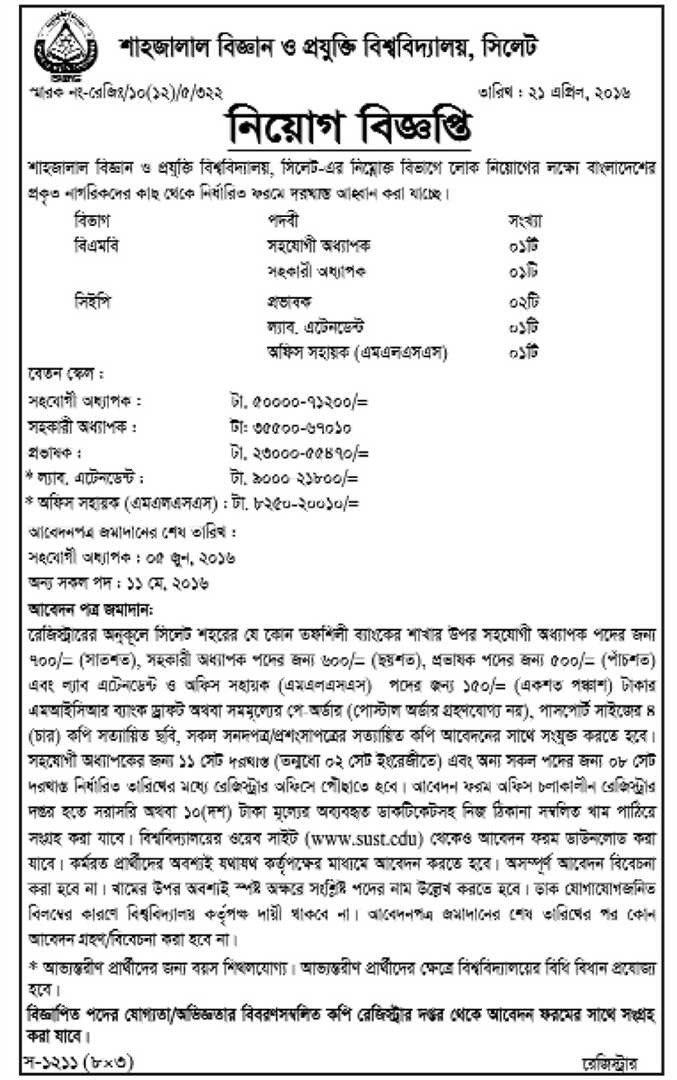 Application should be submitted to the registrar of SUST with a bank draft of Tk 600 to Tk 150.