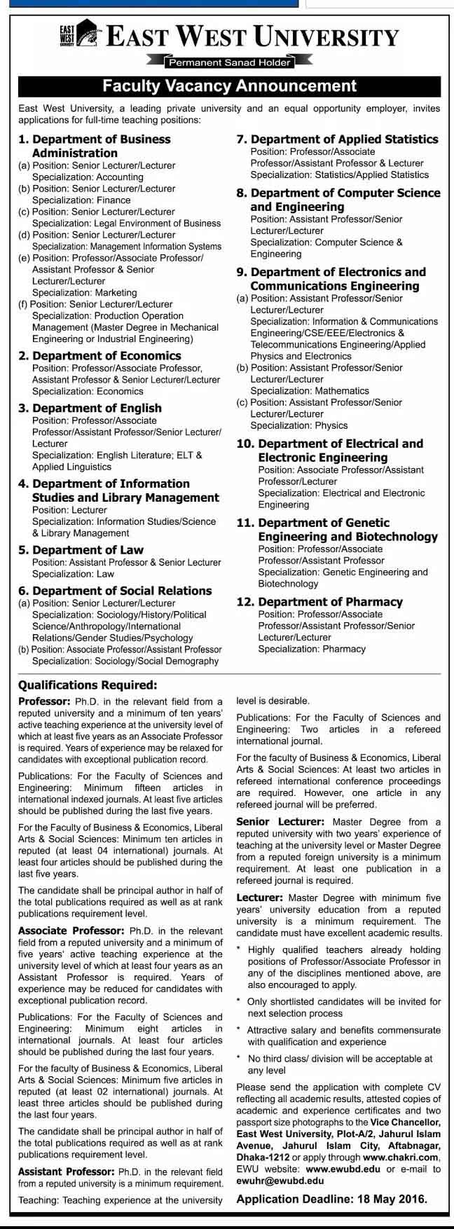 East West University (EWU), Dhaka, Bangladesh announces the vacancy for teaching posts. More than 100 teachers are recruited in its 12 departments.