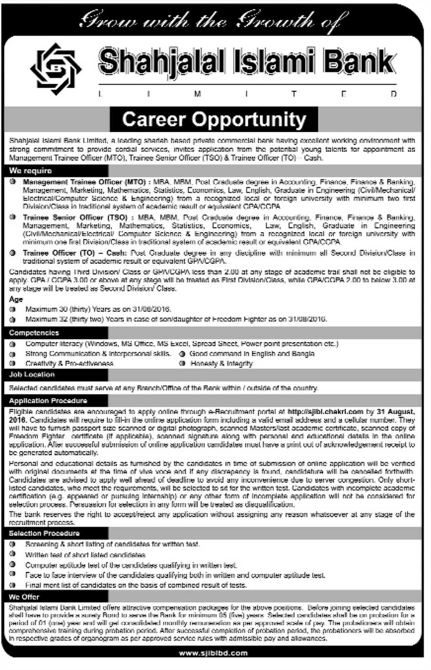 Shahjalal Islami Bank Limited, one of the private commercial banks in Bangladesh offers job for freshers.