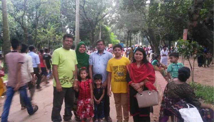 কেউ কেউ আবার বের হয়েছেন দল বেঁধে। শিল্পী আক্তার তাঁর স্বামী আতাউর রহমান, দুই সন্তান ও দেবরের পরিবার নিয়ে বেড়াতে বের হয়েছেন। দুপুরের খাবার সেরেই চলে এসেছেন শ্যামলীর শিশুমেলায়। মোট ৯ জনের এই দলে ছিল ৪ বছরের আনিস আর ৯ বছরের রিমকী।