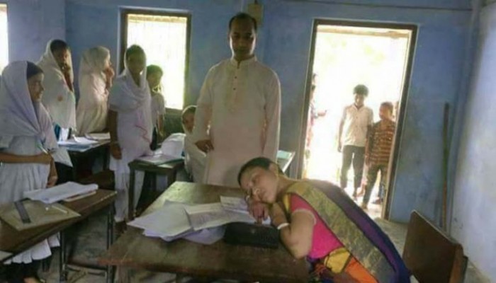 বুধবার ওই স্কুলে পঞ্চম শ্রেণীর মডেল টেস্ট পরীক্ষা চলছিল। পরীক্ষা চলাকালীন সময় টেবিলের ওপর মাথা রেখে ঘুমিয়ে পড়েন শিক্ষিকা দিপ্তি রানী বিশ্বাস।
