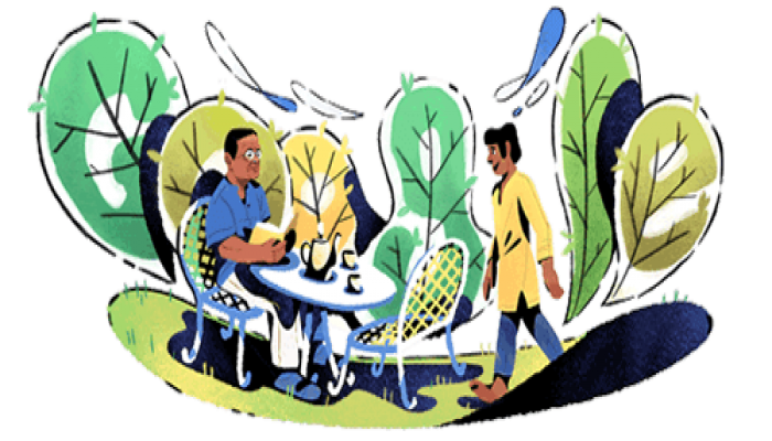 আজ রাত ১২টার পর থেকে গুগলে ঢুকতেই দেখা যাচ্ছে একটি ছবি। বনে ঘেরা সবুজ পরিবেশে টেবিল পেতে নীল জামা গায়ে একজন লিখে চলেছেন।